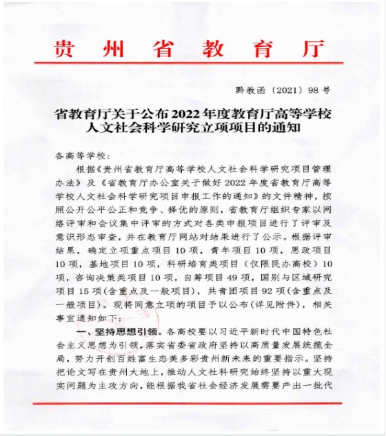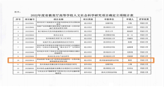 近日,贵州省教育厅公布了2022年省教育厅人文社会科学研究项目申报结果,beat365官网党委书记熊星同志主持的《职业院校“忠诚工匠”培养体系构建研究--以英国beat365官方网站为例》获重点项目立项。本项目是省教育厅遴选立项的10个重点项目中唯一一个由高职院校承担的科研项目,实现了beat365官网在人文社会科学项目中零的重大突破。