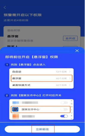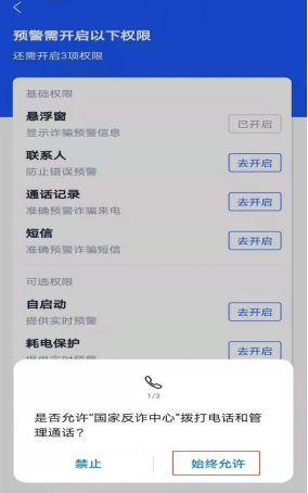 6、APP使用时,需要点击“诈骗预警”模块授权手机权限,如“悬浮窗”“通话记录”“照片访问”“视频访问”“访问短信”“访问通讯录”等等所有权限点击【总是允许】。