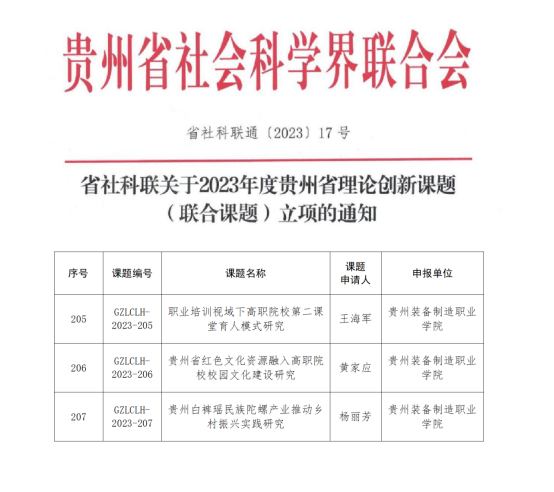 近日,贵州省社会科学界联合会公布了贵州省理论创新课题(联合课题)立项名单,beat365官网获批3项。这是继今年5月份学校党委书记熊星和党委副书记杨丽芳各分别获得1项招标课题、委托课题立项后,学校老师在联合课题立项取得的新突破,特此向获立项的老师及课题组表示祝贺!
