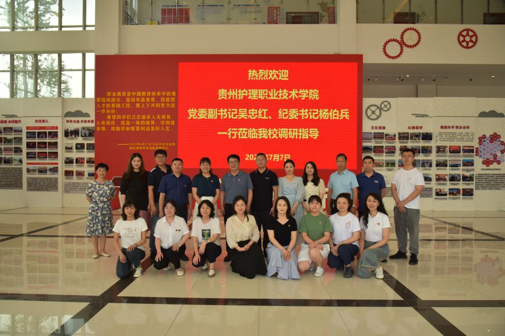 7月7日下午,贵州护理职业技术学院党委副书记吴忠红、纪委书记杨伯兵一行16人到beat365官网参观考察,党委副书记杨丽芳,党委委员、组织部部长张宏,党委委员、宣传统战部部长蒋永彪,党政办、机械工程系、电气工程系、基础教学部、人事处、纪检监察室等相关负责同志参加考察调研、座谈会。