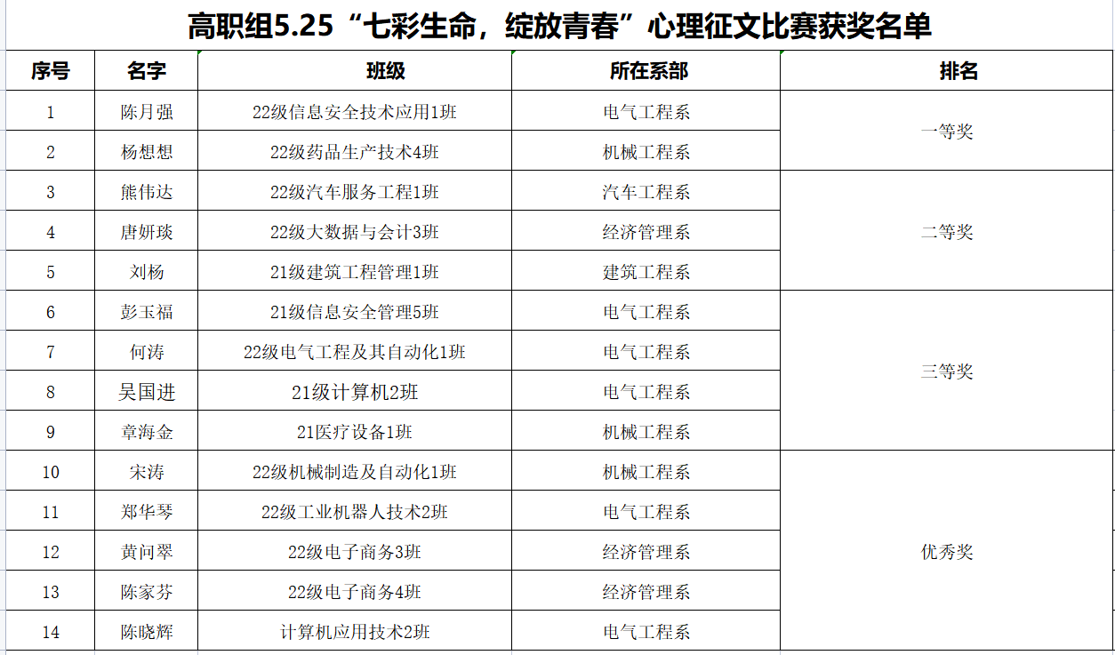 本次比赛共收到了170余份作品。作品内容涵盖了心理健康、自我成长、情感表达、人生观等多个主题,展现了学生们对心理健康的关注和思考。作品以优美的文字、真挚的情感和独特的观点,生动地表达了大学生们在校园生活中的心灵感悟。经过评选,最终共有18名同学获奖,获奖名单如下: