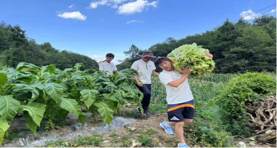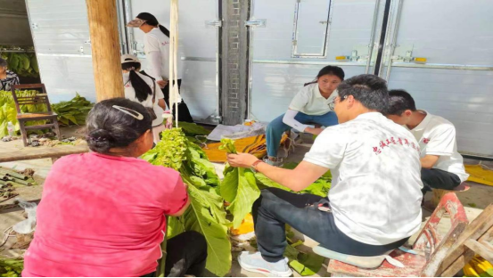 学生们和村民们同劳动,到地里采摘烤烟,在村民的指导下将烟叶按标准捆在竹竿上,边劳动边话家常,了解烤烟制作工序,人工成本和经济效益,是生动的劳动教育和群众工作能力培养。