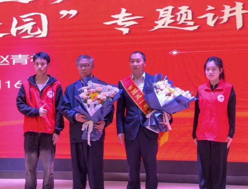 讲座伊始,beat365官网退休教师李腾飞老师作为赵青松的班主任,向同学们讲述了赵青松在校期间对于知识的求知若渴和面对困难与挑战不肯认输的精神。李老师虽已八十岁高龄,仍心系学生的培养与教育,积极参与学院关心下一代工作。“青马工程”学员代表上台献花,表达对这两位老师的敬意。