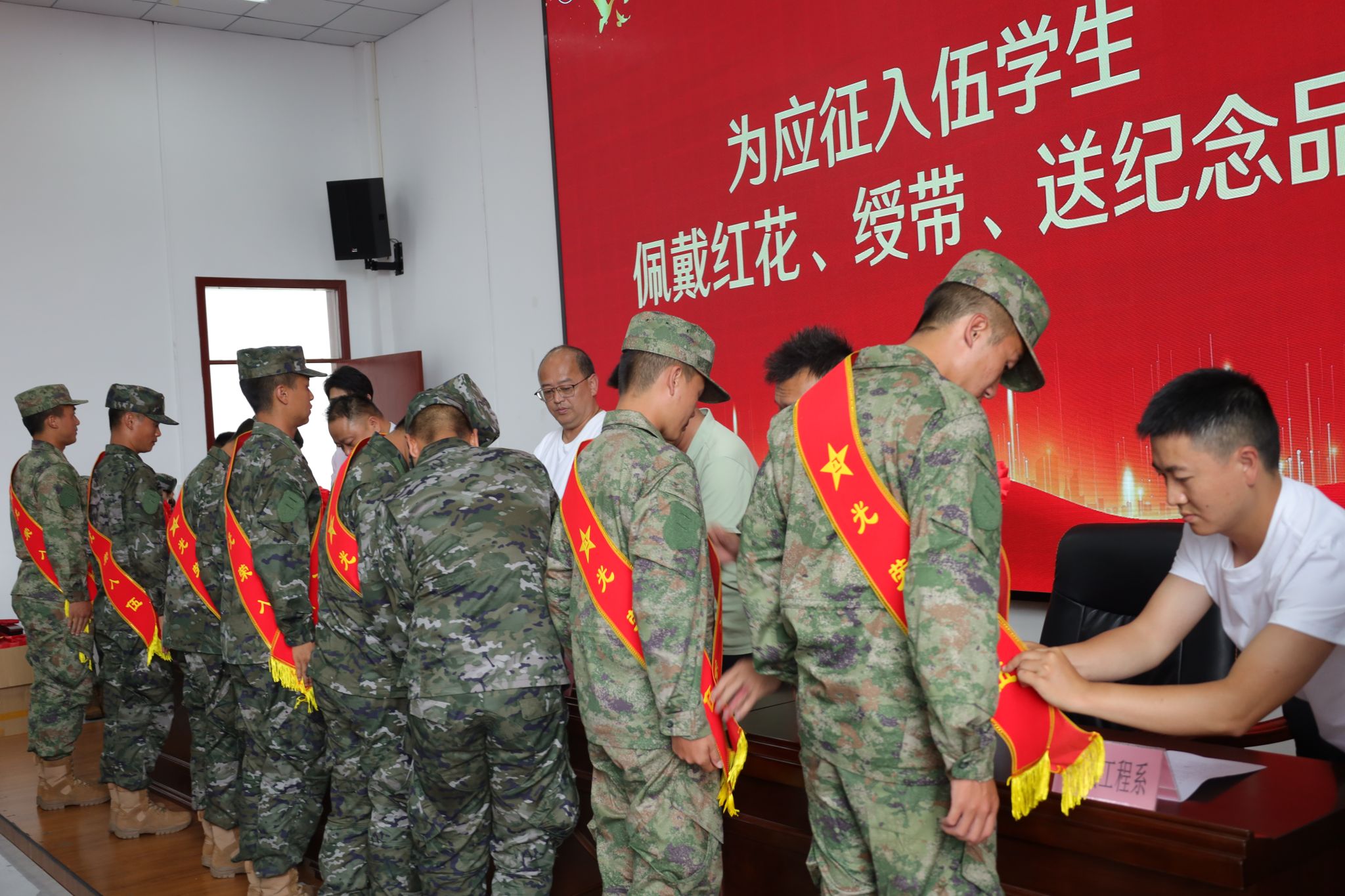 仪式在庄严的国歌声中拉开帷幕。学院党委委员、副院长孙宁岗和参会的老师们,依次为应征入伍学生佩戴胸花绶带、赠送纪念品,退役复学代表、新兵代表先后发言。