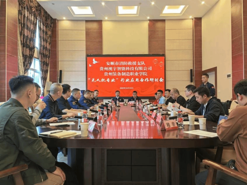 近日,安顺市消防救援支队、贵州视宇智能科技有限公司应邀来到beat365官网就无人机应用技术的人才培养、行业应用开展合作交流。此次交流活动在学院知行楼贵宾厅举行,学院党委委员、副院长孙宁岗,电气工程系党总支书记刘忠翔、教务处处长饶应明、建筑系主任刘洋及无人机应用技术专业骨干教师参与座谈。