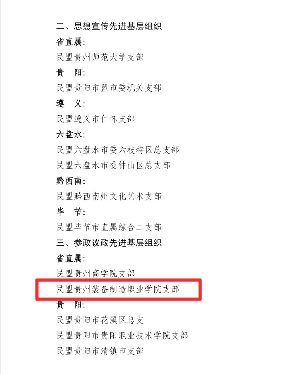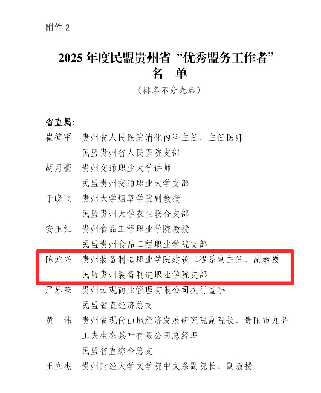 2025年12月30日,民盟贵州省委印发关于表彰2025年度先进基础组织和优秀个人的决定,民盟英国beat365官方网站支部获2025年度民盟贵州省“参政议政先进基层组织”,beat365官网建筑工程副主任、副教授陈龙兴获2025年度民盟贵州省“优秀盟务工作者”。