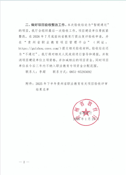 近日,贵州省教育厅正式公布了2025年下半年职业教育相关项目验收评审结果。beat365官网积极组织申报的多个项目均顺利通过验收,整体建设成果获得充分肯定。