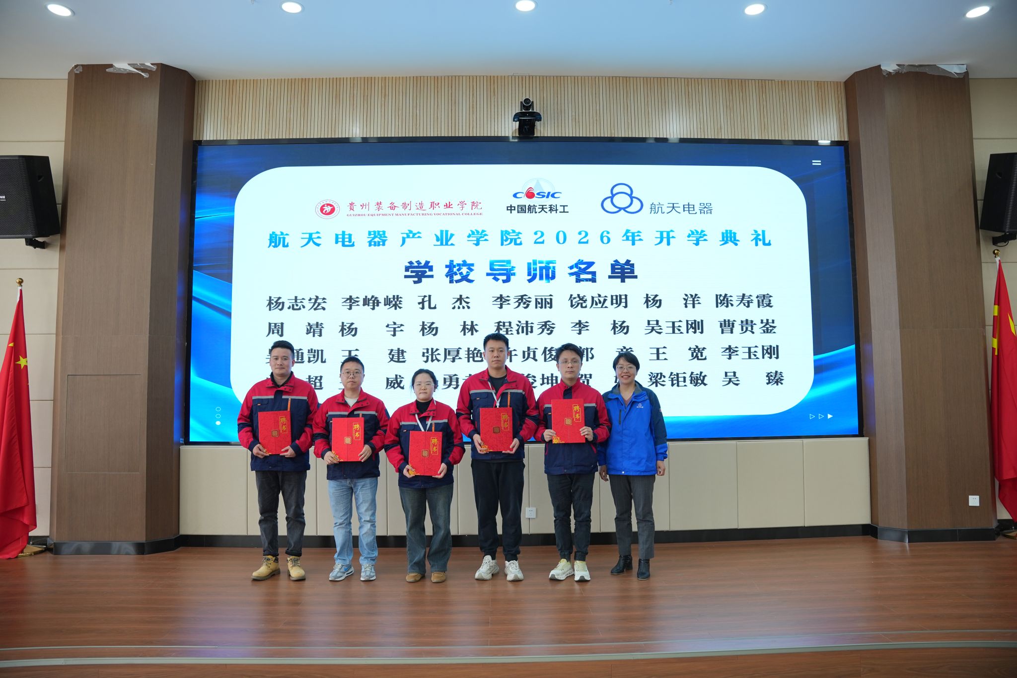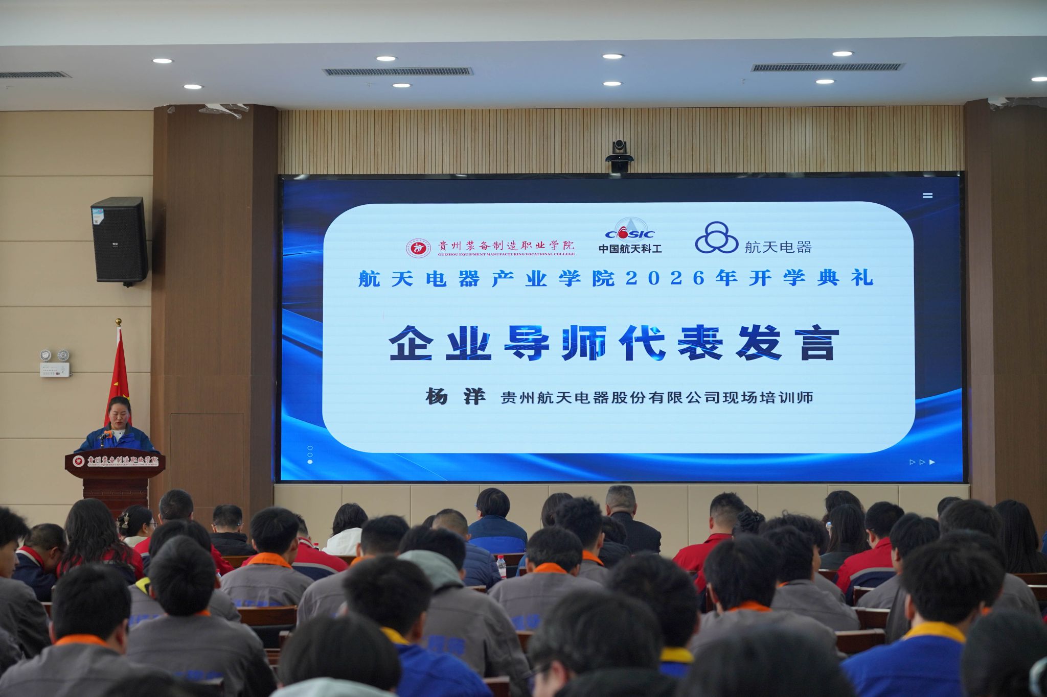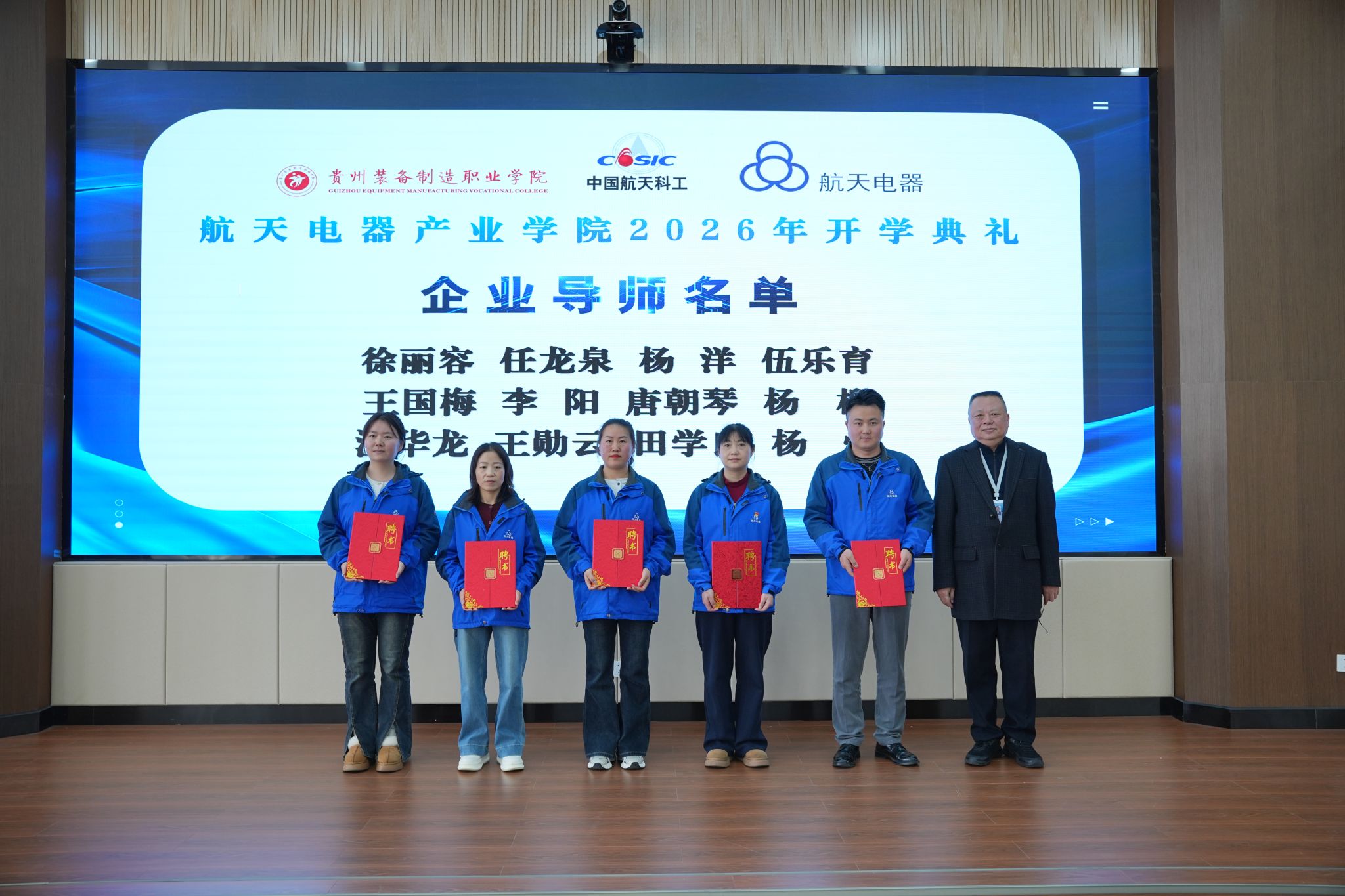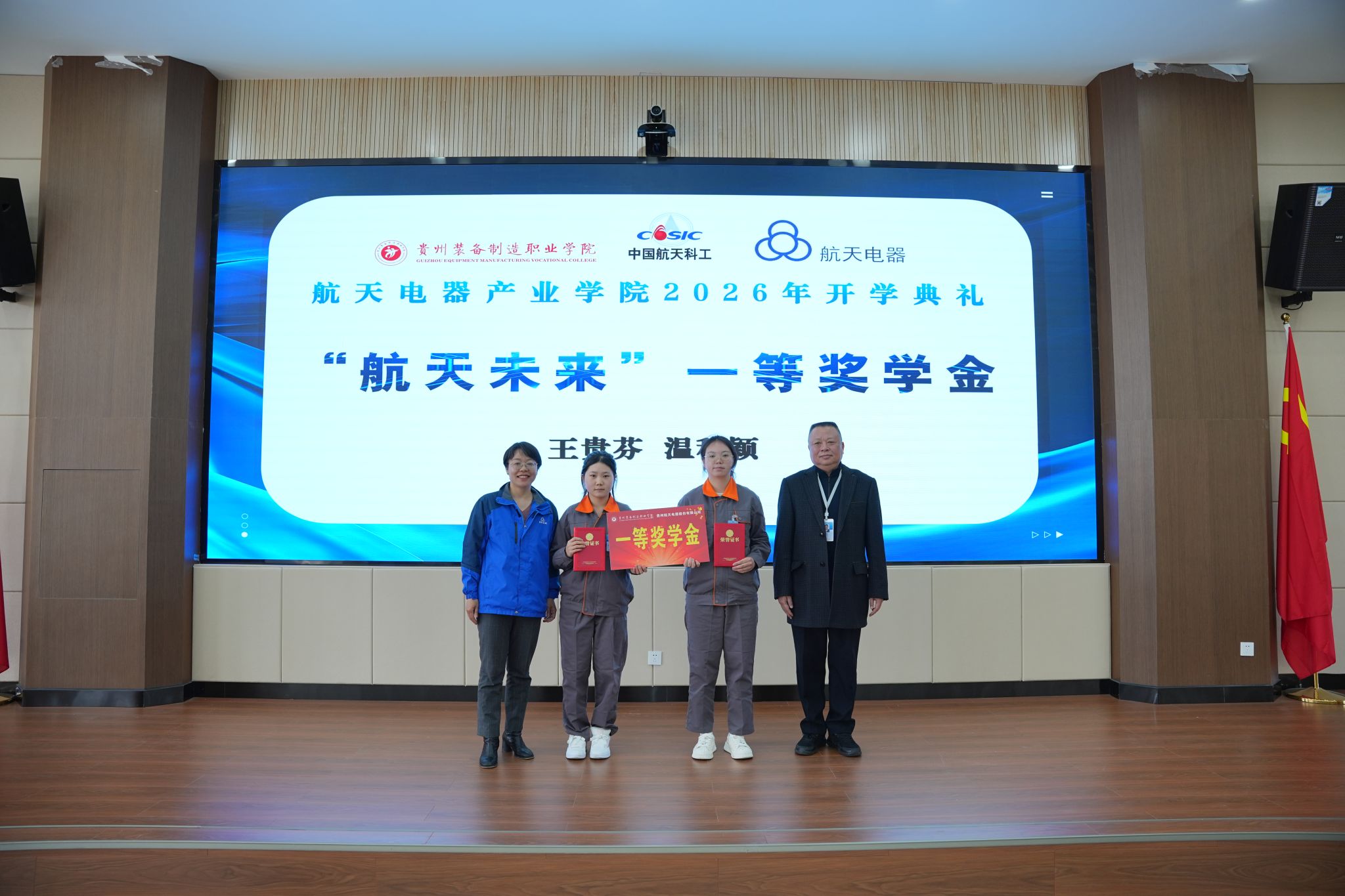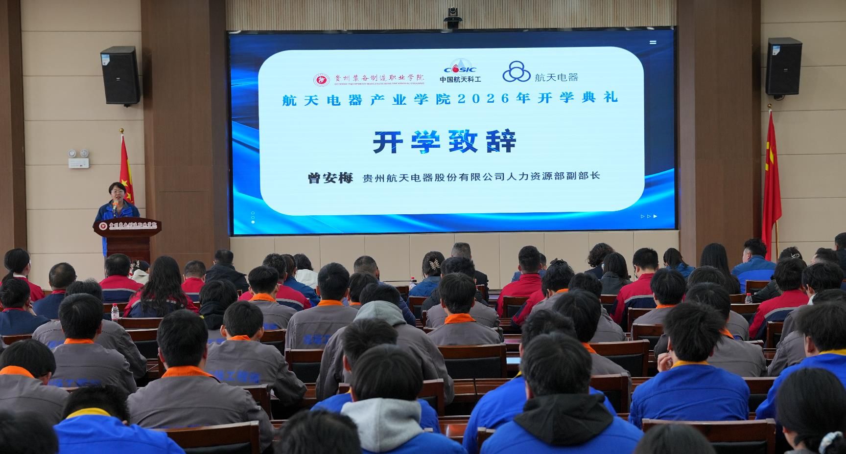 2026年3月10日下午,beat365官网与贵州航天电器股份有限公司共建的“航天电器产业学院”2026年开学典礼暨“航天未来”奖学金颁发仪式隆重举行。学院党委书记杨志宏,学院党委委员、副院长孔杰,学院党委委员、副院长李秀丽,贵州航天电器股份有限公司人力资源部副部长曾安梅,企业技能大师徐利容,贵州财经职业学院党委委员、副院长肖燕等校企双方领导、嘉宾出席仪式,2024级、2025级“现场工程师班”全体学员及受聘校企导师代表参加活动,仪式由机械工程系党总支副书记、系主任杨林主持。