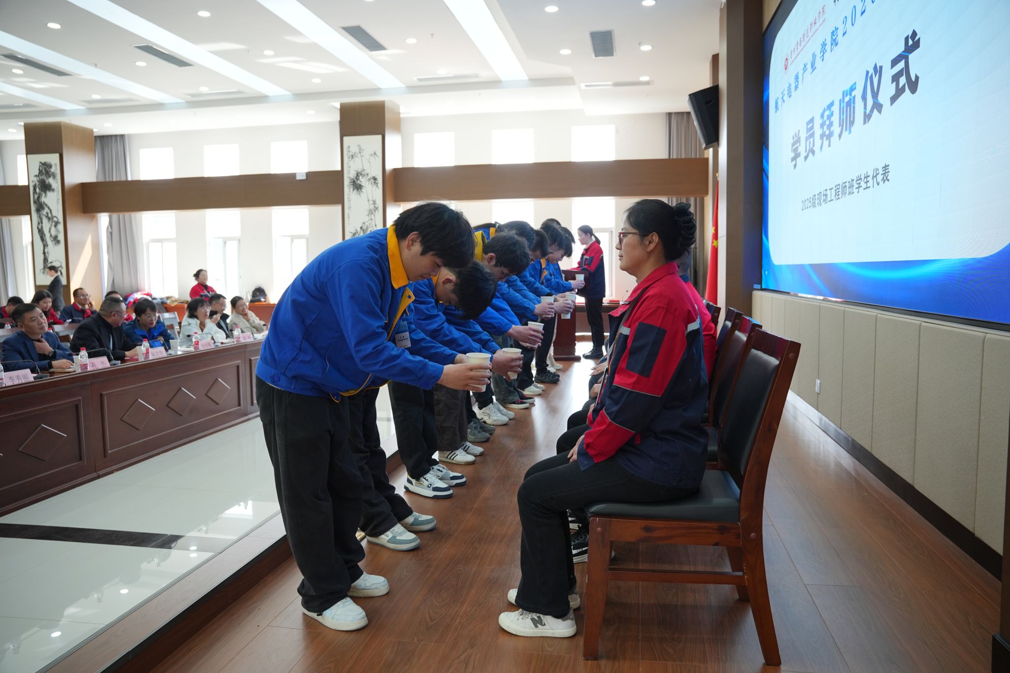 典礼现场,2025级“现场工程师班”拜师仪式顺利举行。新学员分组向校企双方导师行拜师礼、敬拜师茶,以传统礼仪传承匠心技艺、弘扬航天精神,彰显了新时代青年学子尊师重道、勤学精进的良好风貌。