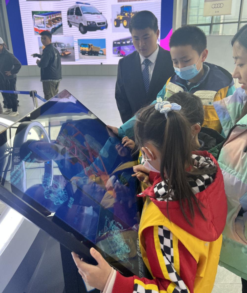 小朋友们首先参观了汽车科普馆、汽车文化场馆,讲解团成员宋婷通过科普馆展品,结合PPT和视频向小朋友们讲解了汽车的发展历程、汽车品牌、汽车名人等,并利用一体机上车牌/车标连连看、汽车材料选择等趣味游戏向小朋友们普及汽车知识,这种寓教于乐的科普形式让小朋友们耳目一新、驻足良久。