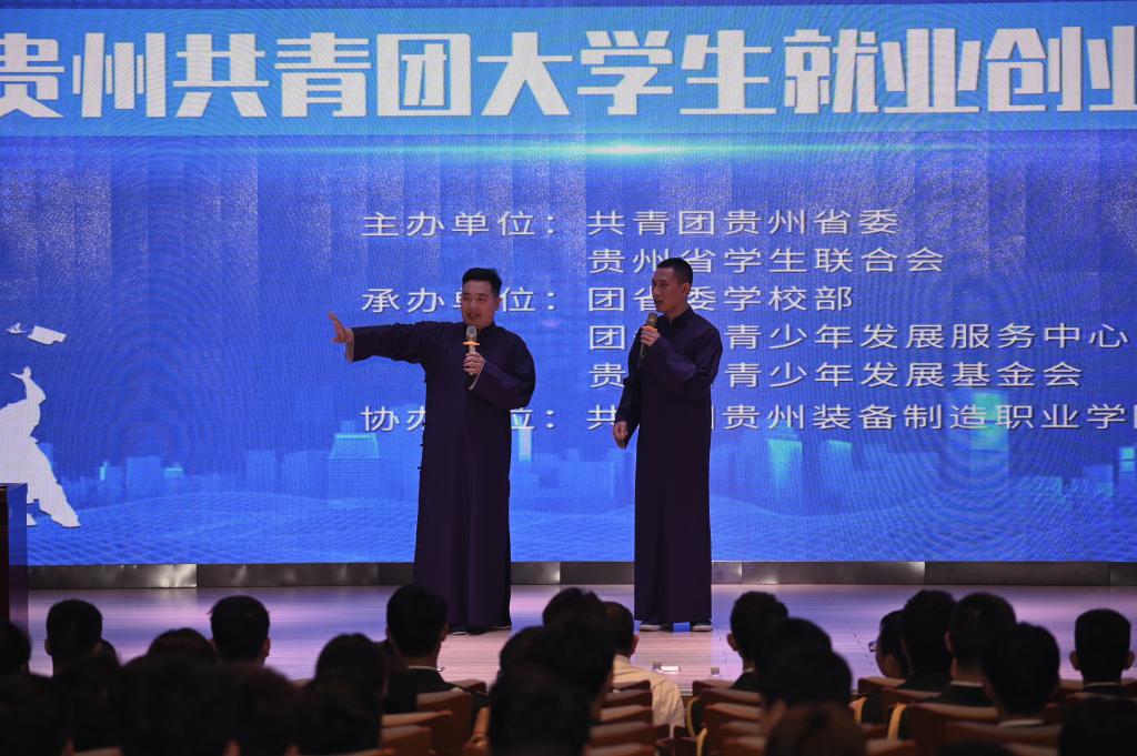 贵州春黔社相声演员以创业就业创作节目进行表演开场