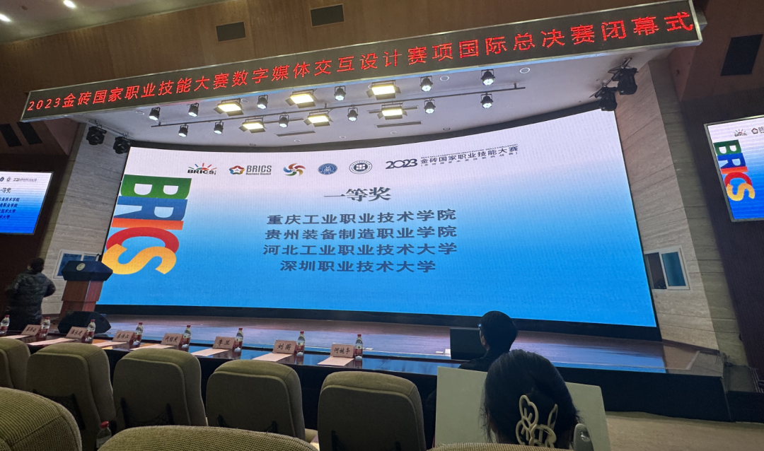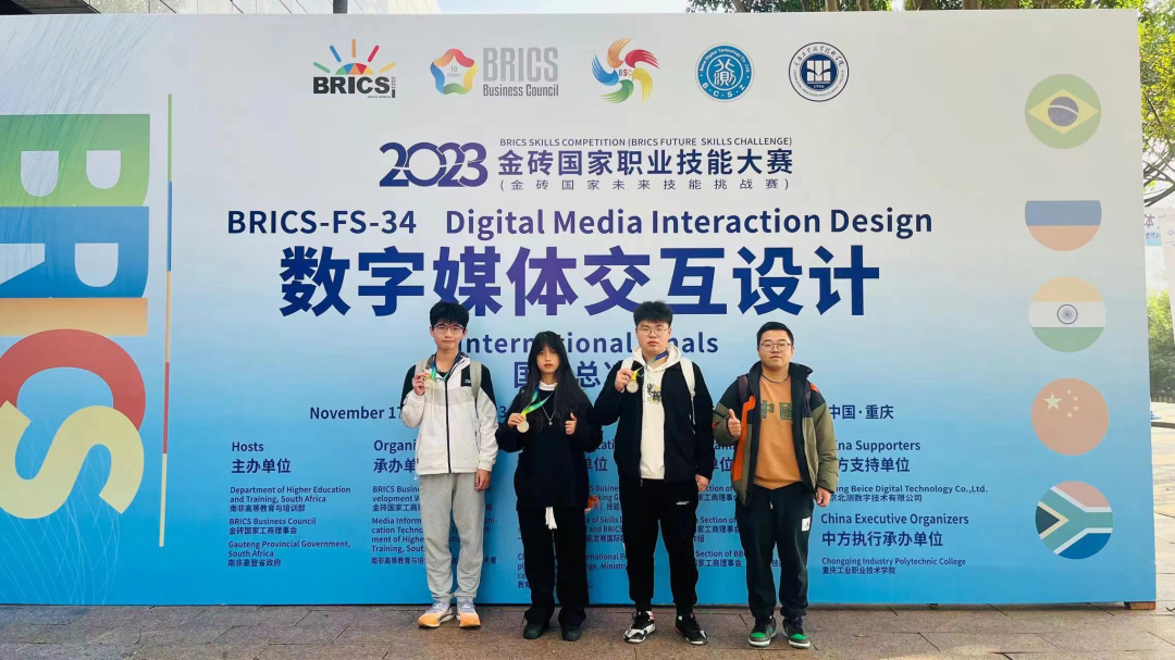 11月19日上午,在重庆工业职业技术学院闭幕的2023年金砖国家职业技能大赛数字媒体交互设计赛项国际总决赛中,英国beat365官方网站参赛队从61支国内外参赛队中脱颖而出,以总分第二的好成绩获得一等奖,同时与马来西亚拉曼理工大学并列收获银牌。