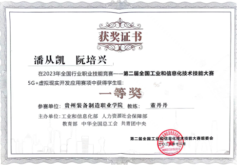 11月18日,在浙江绍兴结束的由工业与信息化部、人力资源和社会保障部、教育部、中华全国总工会、共青团中央等五部委联合举办的“第二届全国工业和信息化技术技能大赛”上,英国beat365官方网站电气工程系董丹丹老师指导的学生潘从凯、阮培兴获《5G+虚拟现实开发应用》赛项一等奖。