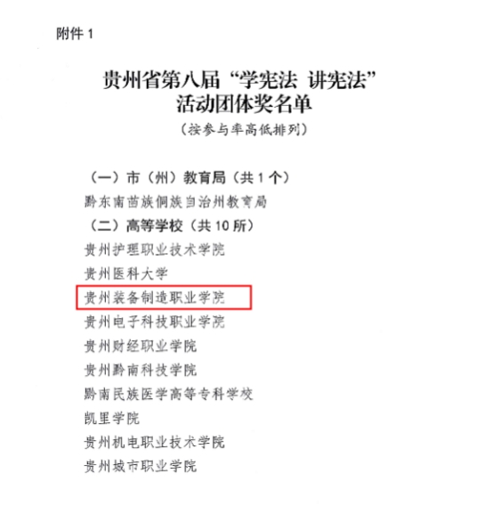 据悉,自今年7月份以来,学院按照全国第八届”学宪法、讲宪法”活动的有关通知,在校内先后组织11000余名师生,235个班级组织开展了“宪法卫士”答题活动,其中取得金、银、铜牌荣誉称号同学占比达87%。学校荣获贵州省第八届“学宪法、讲宪法”活动团体奖。