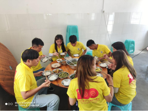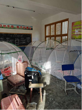 下午13:40分,全体队员乘坐的大巴载满米、油、文具、玩具、墙绘颜料等物资到达荔波县水岩村中商水岩希望小学,在水岩小学的学生食堂吃了此次活动的第一顿饭,并用水岩小学的教室作为队员住宿的驻扎地。