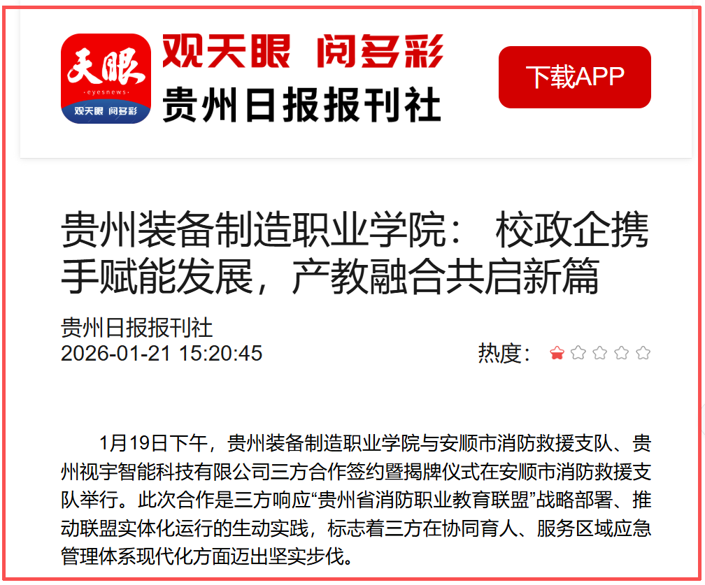 贵州视宇智能科技有限公司总经理张琦表示,作为低空智能技术领域的深耕者,企业将充分发挥技术与装备优势,将无人机智能巡查、空地一体化平台等核心产品融入实训基地建设,同时选派技术骨干参与人才培养方案优化,为合作提供全方位支撑。
