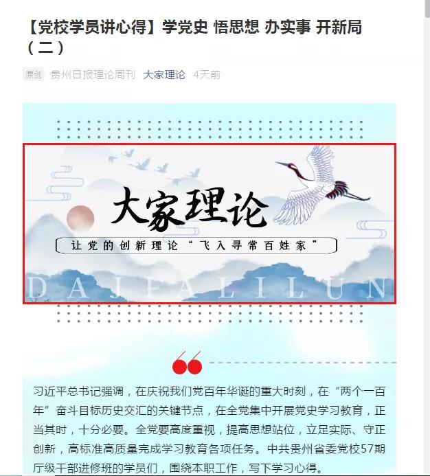 5月14日,贵州日报理论周刊“大家理论”以《【党校学员讲心得】学党史悟思想办实事开新局(二)》为题刊载了学院党委书记熊星《让思政课立起来、燃起来、活起来》一文。