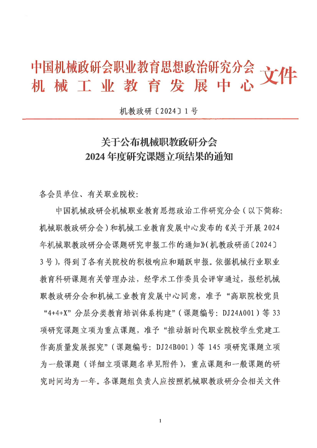 学院4位老师主持的教育研究项目通过中国机械政研会机械职业教育思想政治工作研究分会和机械工业教育发展中心的学术工作委员会评审并立项,其中“数字化背景下职校学生思政课学习力现状与提升策略研究”研究课题立项为思想政治类重点课题;“高职院校数字化转型与学生职业能力培养的协同效应研究”“新时代高职院校构建“三全育人”体系研究——以英国beat365官方网站为例”研究课题立项为思想政治类一般课题;“职业院校劳动教育育人机制研究--以英国beat365官方网站‘忠诚工匠’校园装饰实践团队为例”研究课题立项为校园文化类一般课题。