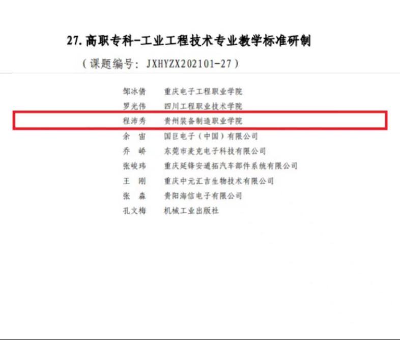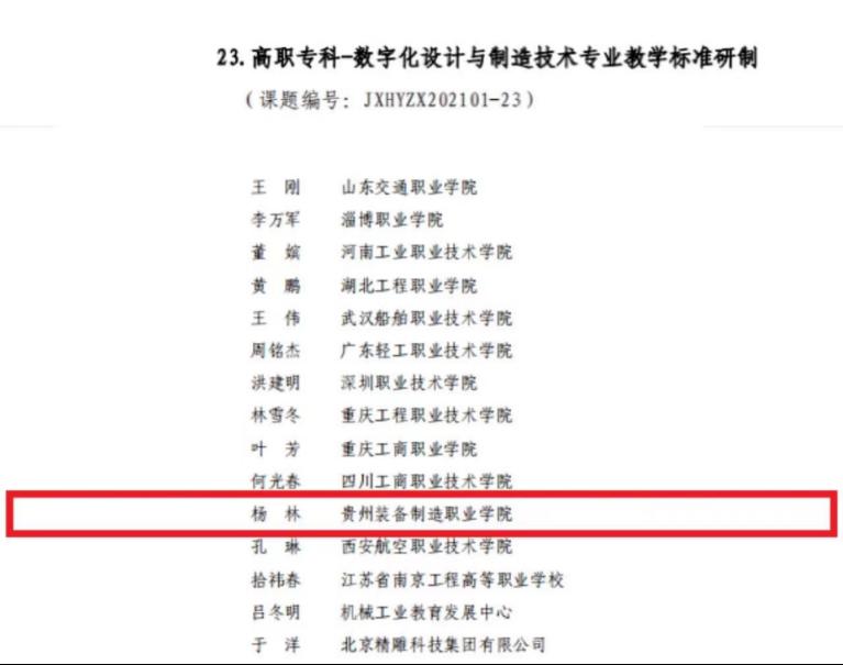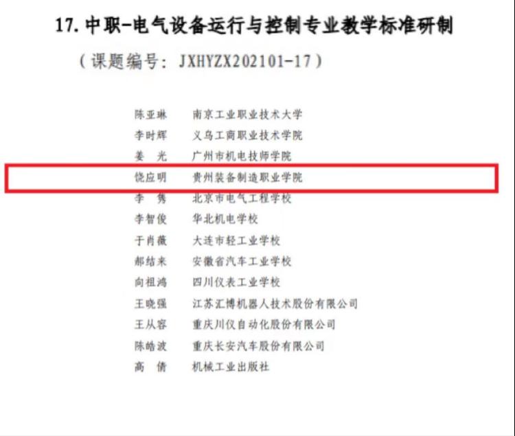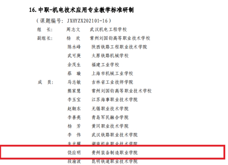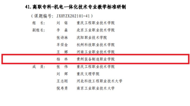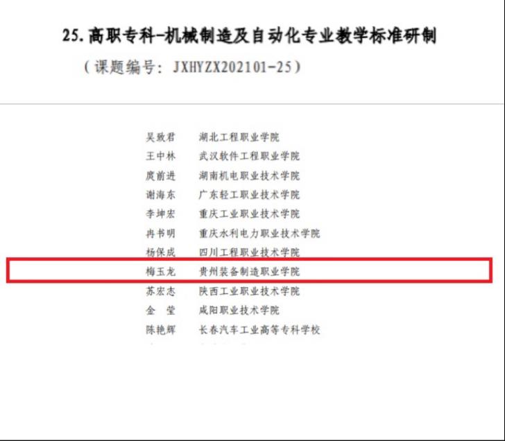 beat365官网按照教育部职成司《关于启动<职业教育专业简介>和<职业教育专业教学标准>修(制)订工作的通知》(教职成司函[2021]34号)的工作安排和要求,积极参与《职业教育专业目录(2021年)》装备制造大类下中职、高职专科、高职本科共64个专业的《职业教育专业简介》和《职业教育专业教学标准》(以下分别简称《简介》和《标准》)的修(制)订工作。根据《关于机械行指委“职业教育装备制造大类相关专业简介和教学标准研制”课题立项的通知》机职职委[2021]2号文件,以下6名教师荣获“2021年度全国机械行业职业教育专项科研课题”立项9项,课题研究时间自2021年9月起,为期半年,以下为课题组名单。