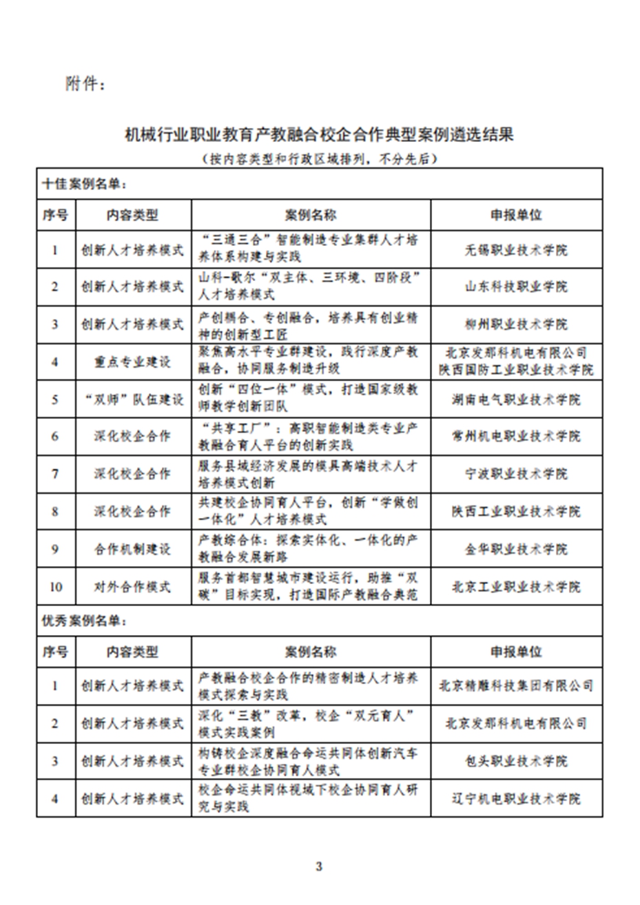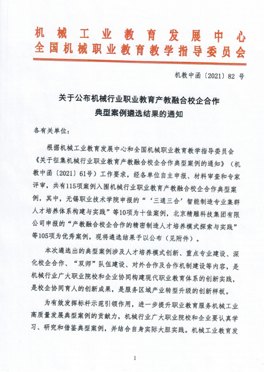 beat365官网参加机械工业教育发展中心和全国机械职业教育教学指导委员会组织的职业教育产教融合校企合作典型案例申报,经材料审查和专家评审,共有115项案例入围机械行业职业教育产教融合校企合作典型案例,其中,beat365官网申报的案例《校企合作开展基于3D打印的铝制品快速熔模铸造技术攻关》获优秀案例。