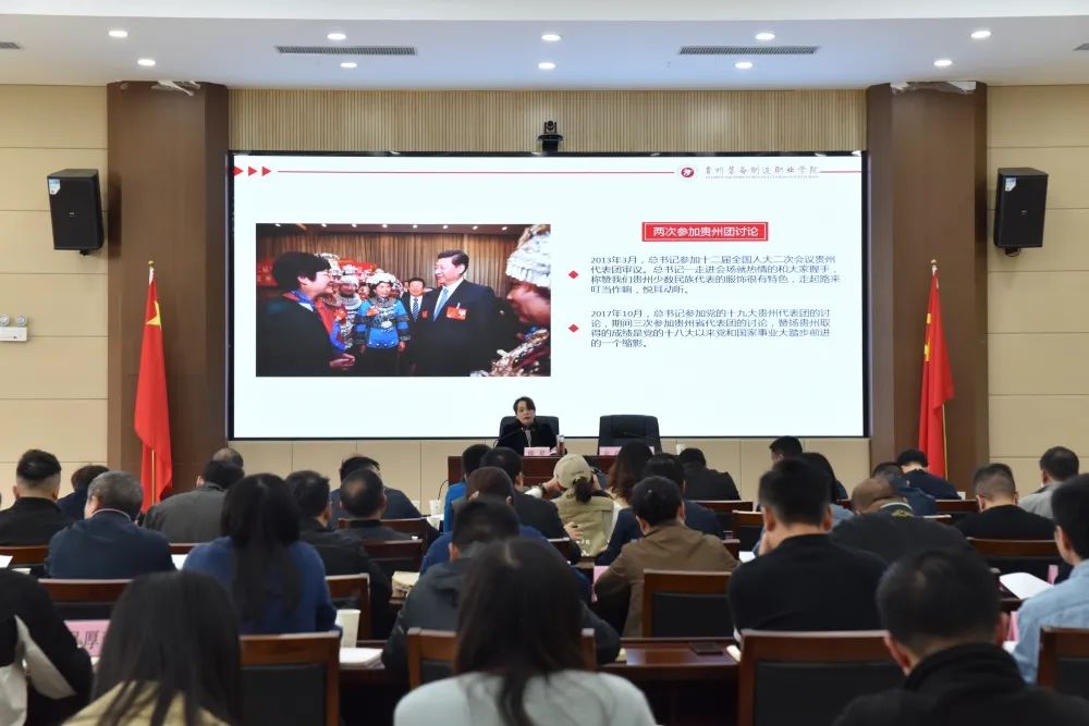 党委书记熊星从习近平总书记心系贵州发展情系贵州人民、擘画蓝图;职业教育地位空前提高、培养忠诚工匠;筑牢职教之魂三个方面进行讲授,全面回顾习近平总书记六次来到贵州,一次视察学校情况,这些年来,贵州和beat365官网发生翻天覆地的变化是在以习近平同志为核心的党中央对贵州的亲切关怀下,国家重视贵州发展,先后出台了两个重大文件给予贵州支持关心关怀的结果。