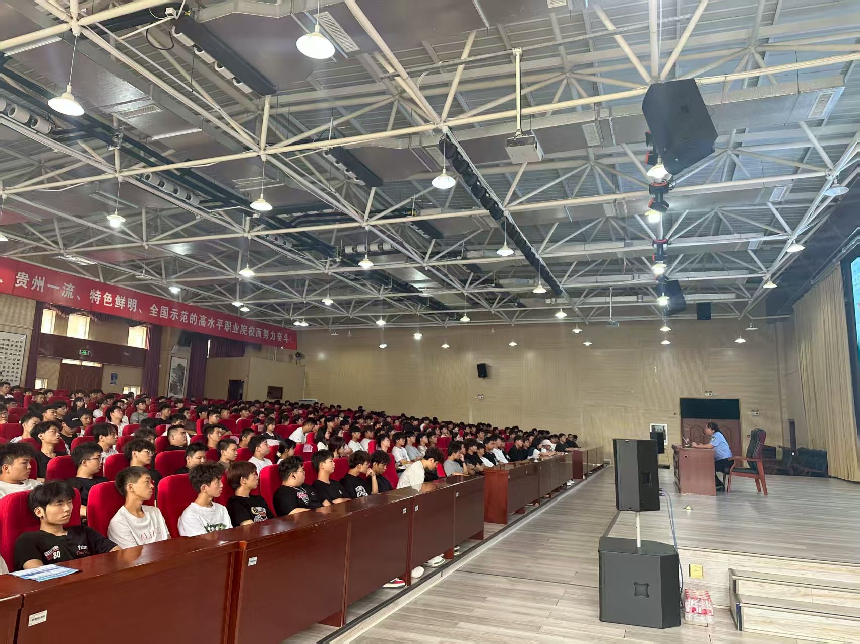 为贯彻落实《清镇职教城2025年秋季学期反诈护航行动工作方案》,提升2025级新生反诈能力,筑牢校园安全防线,beat365官网昨日特邀清镇市公安局法治大队刘贤警官,在德润楼101会议室开展“反诈第一课”主题宣讲。本次讲座由保卫处工作人员主持,约400名学生宿舍寝室长参会。