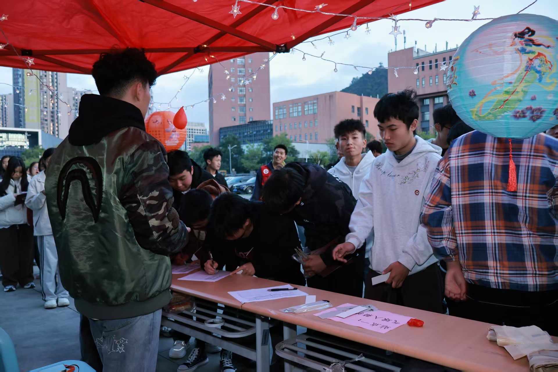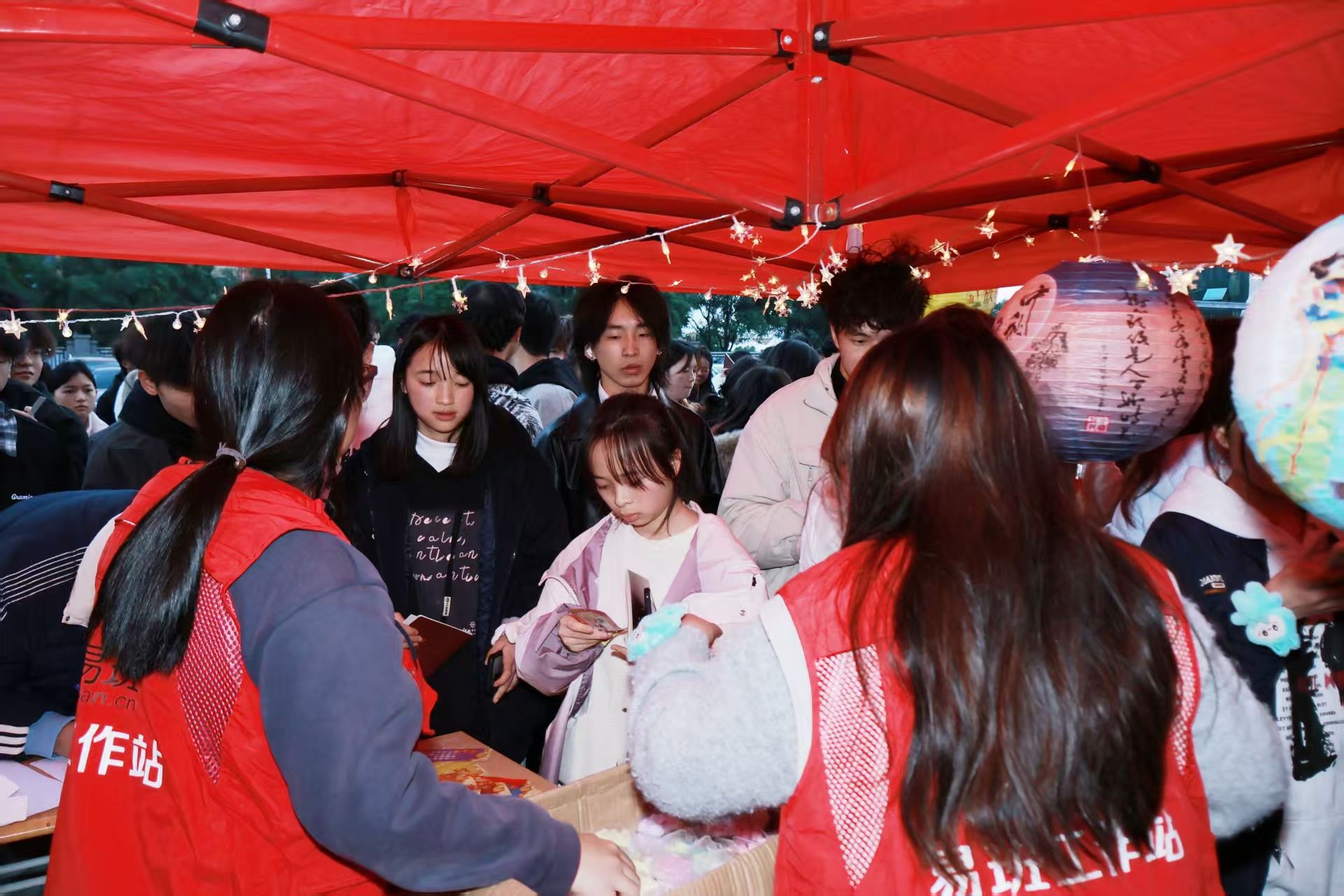 挂满灯谜的区域前,同学们或独自揣摩、或三五成群讨论。“一口咬掉牛尾巴”、“半部春秋”等谜题,藏着汉字精妙。同学们自选作答,每次答对都收获印章,既锻炼思维,更拉近彼此距离,第五枚印章成为智慧见证。